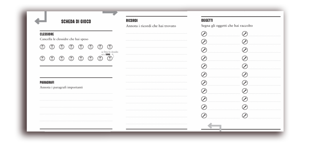 5. All’inizio di ogni libro si trovano delle pagine pratiche per agevolare ragazze e ragazzi nel gioco: bisognerà cancellare le clessidre per calcolare il punteggio finale, segnarsi paragrafi e ricordi scovati durante il gioco e anche la lista degli oggetti trovati durante la lettura. Vi lasciamo sotto un esempio.